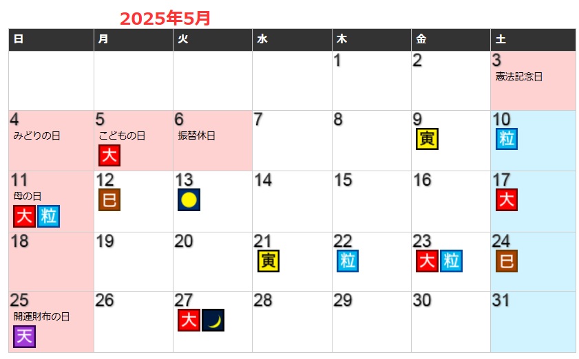 - 天赦日: 「天がすべてを許す日」とされ、何を始めても吉となる最高の開運日です。特に新しいことをスタートするには絶好の日です。
